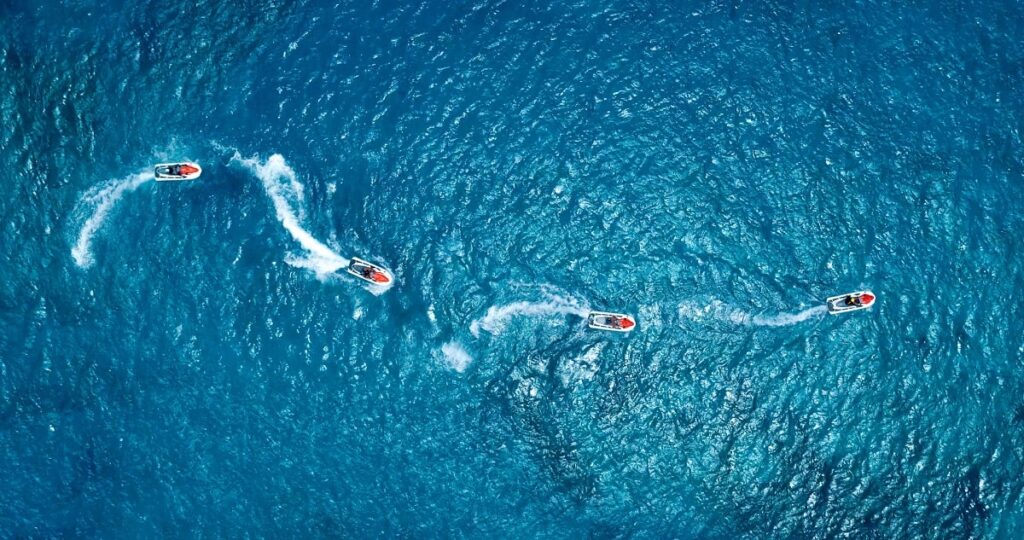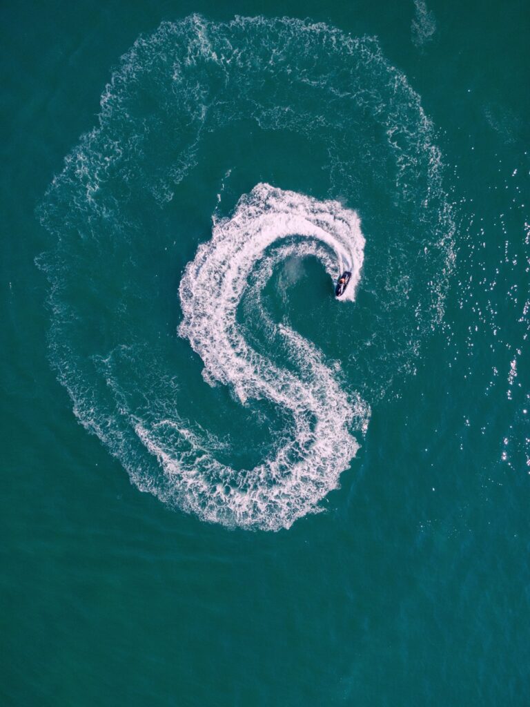 Беспилотник способен сделать невероятно красивый эффект, словно объект съемки сзади себя оставляет следы на водной глади. Этот прием стоит использовать, если вы снимаете гидроциклы.
