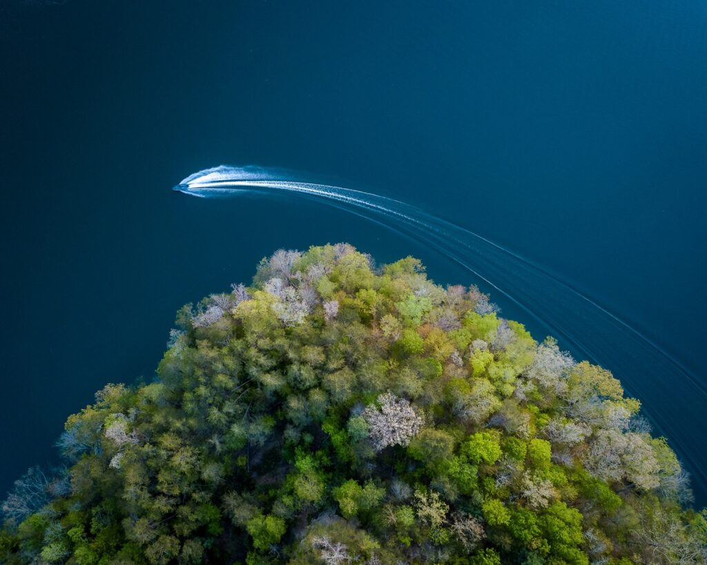 Этот вид водного транспорта способен быстро и грациозно скользить по водной глади. Заснять такую скорость сможет только ловкий и опытный владелец беспилотника.
