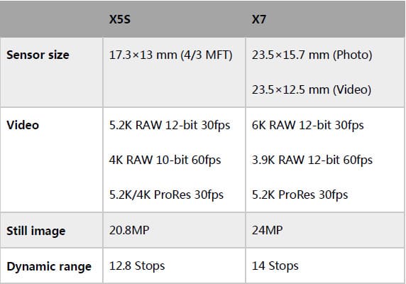Для камер X5R и X5S характерна качественная работа в условиях недостаточной освещенности. Заявленные показатели диапазона матрицы составляют 12,8, но по ощущениям от использования создается впечатление значительно более высоких показателей. Для камеры X7 показатели динамического диапазона несколько выше – 14, что соответствует показателям камер Sony FS-7. В целом необходимо признать, что специалисты DJI приложили значительные усилия для создания в ограниченный срок новой камеры, превосходящей по своим возможностям DJI X5R.