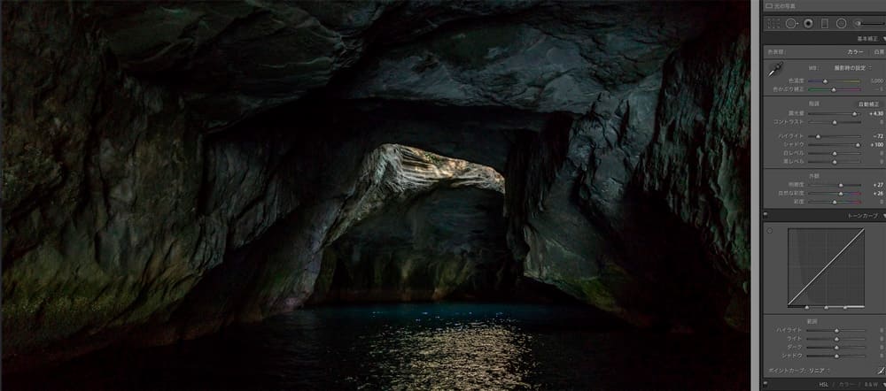 Экспозиция была настроена на свет, попадающий в пещеру через проход. В процессе проведения редактирования был применен шаг 4.3 с уборкой шумов. В большинстве случаев фотографии при таких условиях обладают размытостью изображения, но в данном случае результат получился очень хороший.