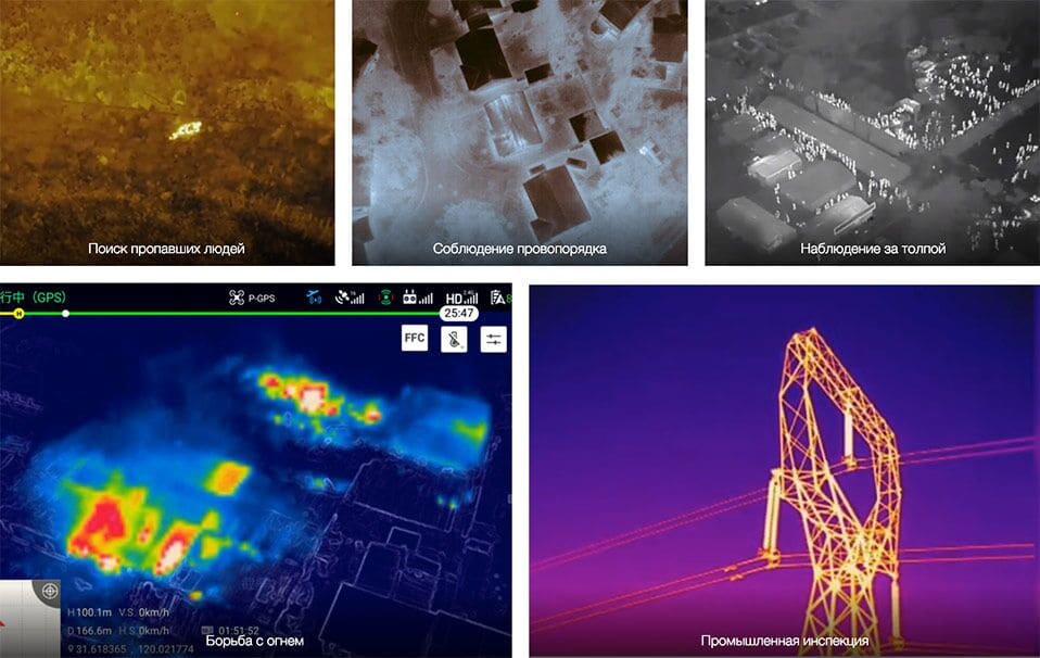 Полиция использует беспилотники при поиске пропавших беглецов, туристов. Пожарные следят с помощью них за скоростью и масштабами распространения огня в лесных массивах и тем, как выполняются операции по его ликвидации. Тепловая камера работает и через задымление.