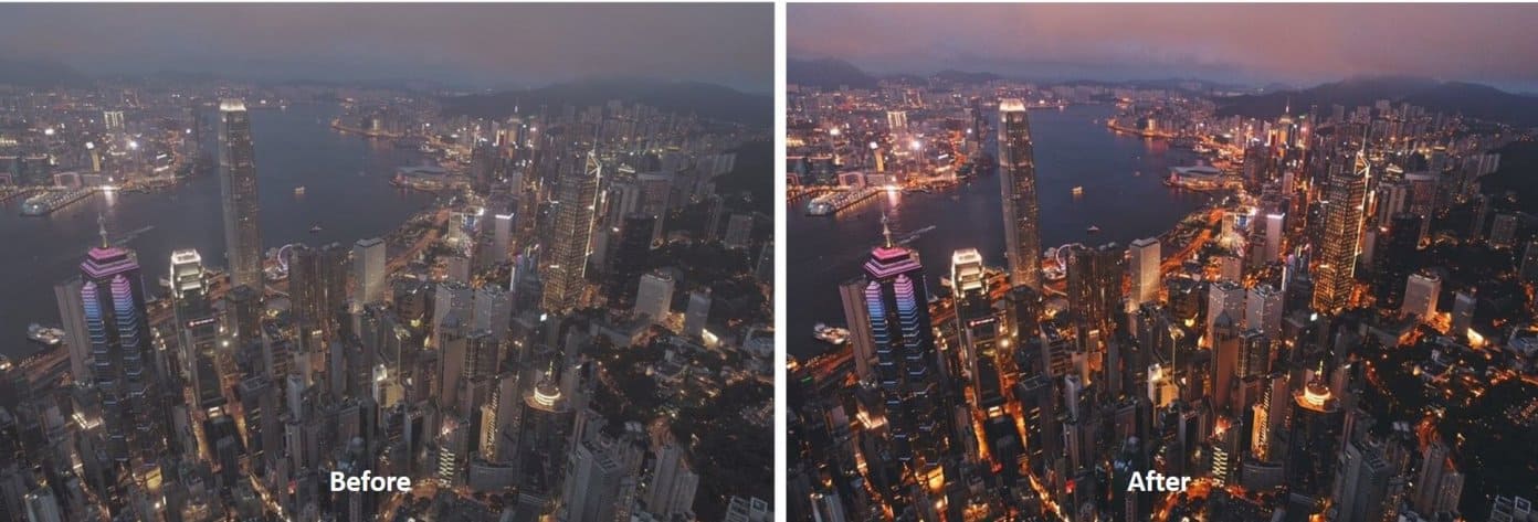 Слева показано исходное фото в формате Raw, сделанное при помощи дрона Phantom 4 Pro, справа — результат его обработки.