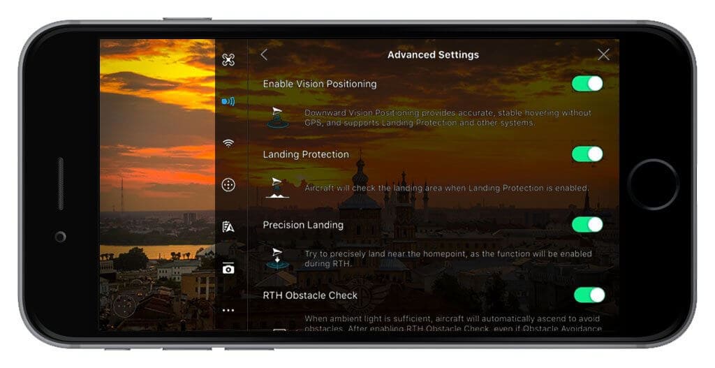 Еще одна полезная функция – это «RTH Obstacle Check». Аппарат будет сканировать путь, выявляя все имеющиеся препятствия. Если квадрокоптер почувствует перед собой препятствие, то он автоматически поднимается выше.