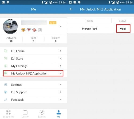 Выполним еще одну проверку. Для этого необходимо открыть приложение DJI Go и зайти в личные данные, здесь выбираем пункт My Inlock NFZ Application. В меню, которое открылось, можем увидеть перечень разрешенных зон.
