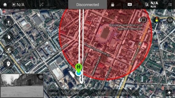 Такого разгильдяйства я раньше не допускал и вам не советую, но перейдем к сути. Взлет, коптер, не видя за домами спутников, поднимается примерно на 50 метров и делает несколько кадров. И тут начинается самое интересное, поймав спутники, аппарат определяет свое расположение на местности и выдает, что он находится в No Fly Zone.