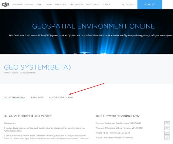 Вдохновленный этим изображением я решил самостоятельно опробовать систему. Убедиться, как все функционирует можно на сайте DJI.com, зайдя в раздел «Geo System» (ссылка на него располагается «в подвале»). Затем нажимаем на ссылку «Advance Unlocking».