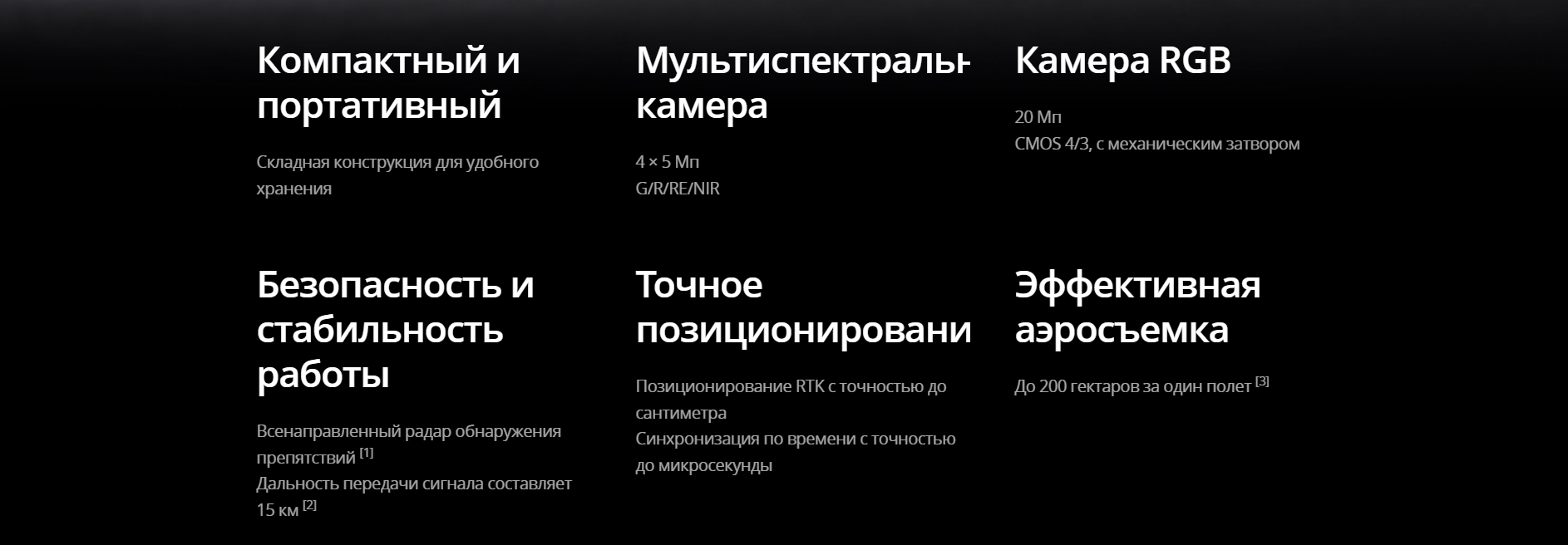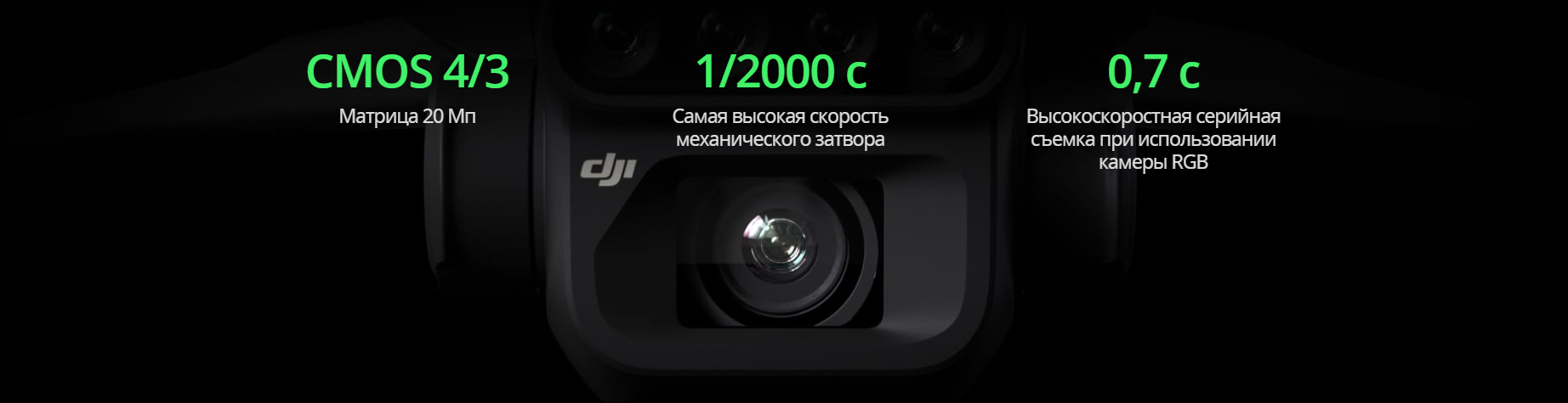 - одна камера RGB (CMOS 4/3″, число эффективных пикселей: 20 Мп) и четыре мультиспектральные камеры (CMOS 1/2,8", число эффективных пикселей: 5 Мп)