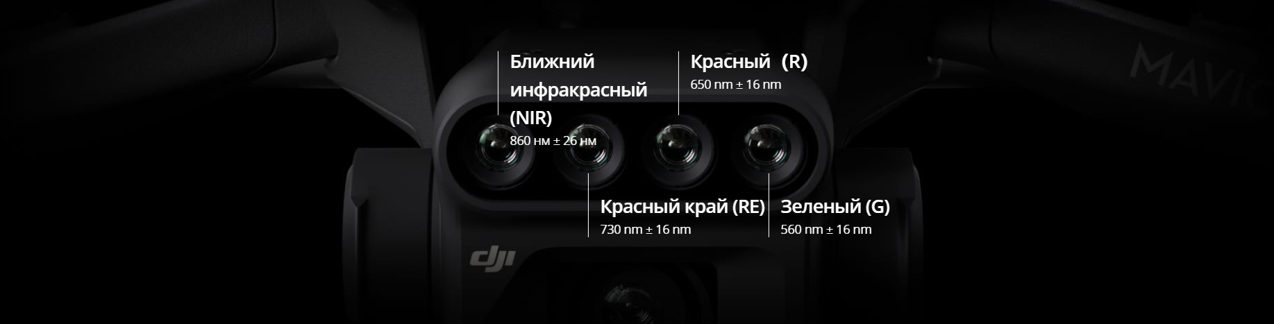 - Зеленый (G): 560 нм ± 16 нм; Красный (R): 650 нм ± 16 нм; Красный край (RE): 730 нм ± 16 нм; Ближний инфракрасный (NIR): 860 нм ± 26 нм