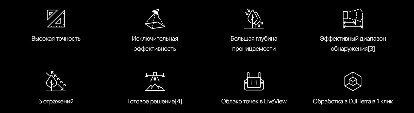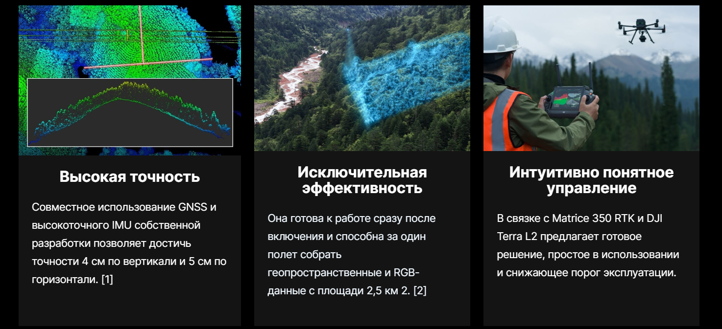 Zenmuse L2 объединяет в себе систему лидарного сканирования, высокоточный IMU собственной разработки и картографическую камеру 4/3 CMOS RGB, обеспечивая полетным платформам DJI более точный, эффективный и надежный сбор геопространственных данных. При использовании в связке с DJI Terra эта камера является готовым решением для сбора 3D-данных и высокоточной постобработки.