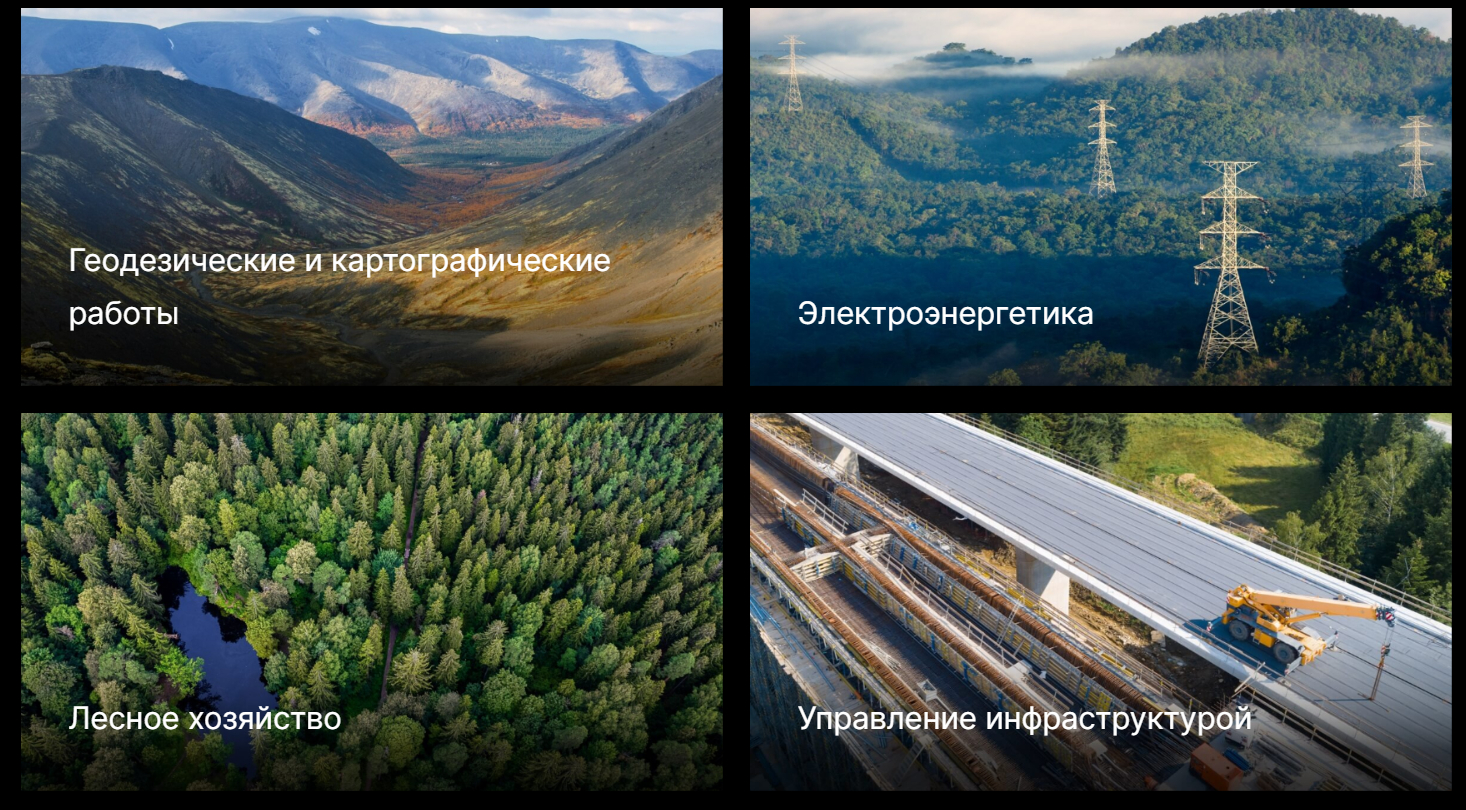 Поддерживаются типы маршрутов “Полет по точкам”, “Область/Площадная съемка” и “Линейный маршрут”, что позволяет решать задачи геодезии в различных средах.